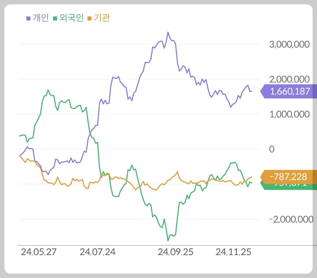 고점에서 지속적으로 매물을 출회하며 주가 하락을 주도했던 외국인 투자자들이 최근에는 매도를 멈추고 관망하는 모습입니다. 이에 따라 기관과 개인 투자자들도 뚜렷한 방향성을 보이지 않으며 신중한 태도를 유지하고 있습니다. 앞서 언급한 것처럼, 저 역시 반도체 섹터에 대해 당분간 관망 의견을 유지하고 있으며, 주요 투자자들의 수급 흐름도 같은 맥락에서 움직이고 있다고 판단됩니다. 따라서 SK하이닉스의 수급 부문 종합등급은 C등급으로 평가하겠습니다.